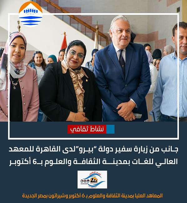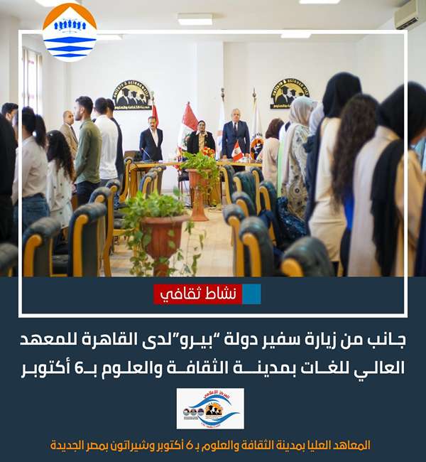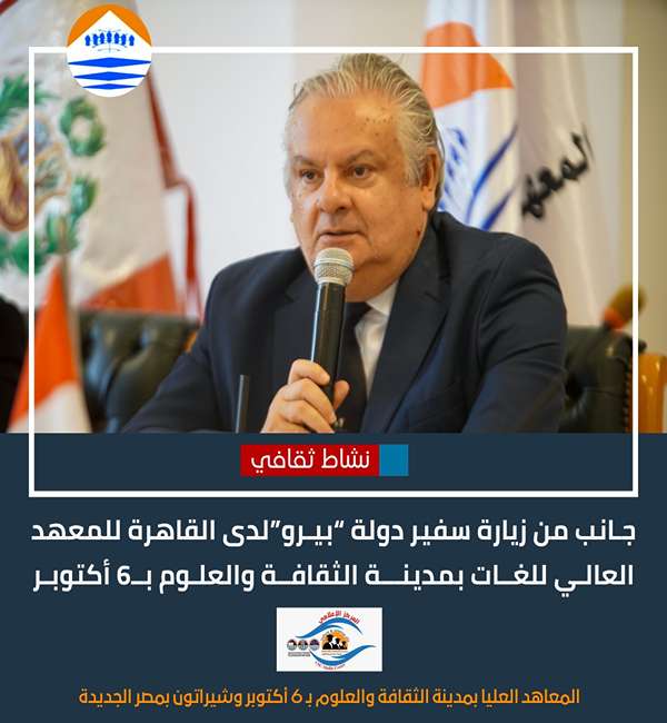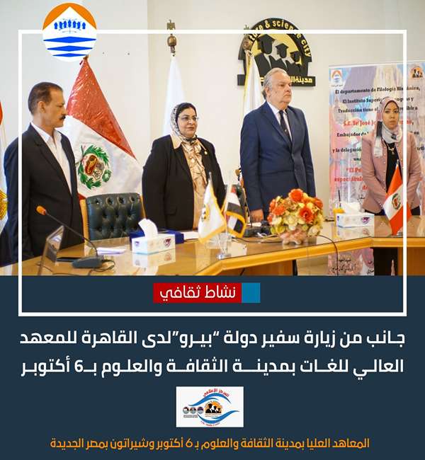 استضاف المعهــد العالـي للغات بمدينـة الثقافــة والعلـوم بــ6 أكتوبــر معالي السفير خوسية خيسوس جييرمو سفير جمهورية بيرو في القاهرة خلال ندوة بعنوان: "البيــرو وتاريخهـــــا وعـــــروضهـــــــا الثقافيــــة في جميع أنحـــاء العالـــــم"